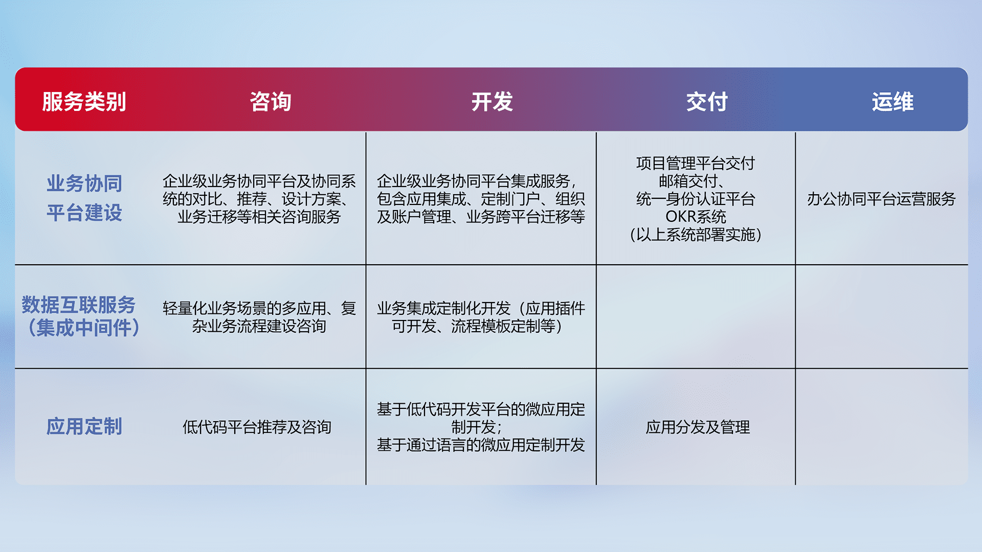 针对钉钉、、、、企微、、IDaas等平台级产品提供产品的规划、、方案、、交付、、定制化开发等服务,,,实现如统一协同办公、、、智能客户服务、、混合会议管理、、、、智能数据查询、、等业务场景,,,,实现数字化转型。。